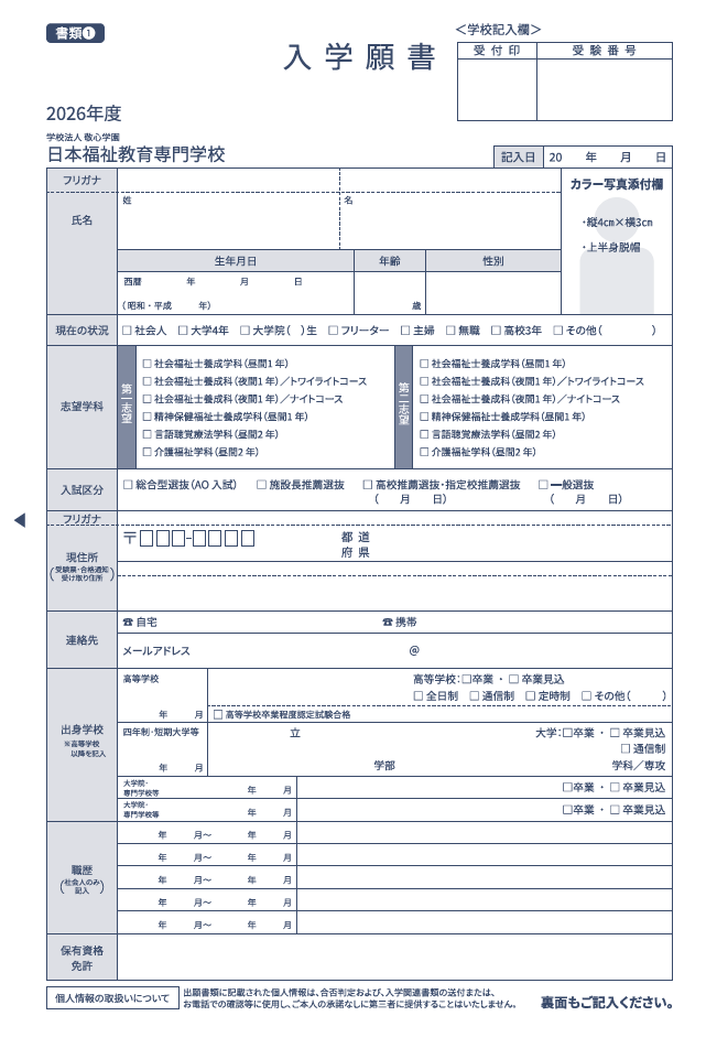 ※介護福祉学科のみ9/1~入学願書提出となります。