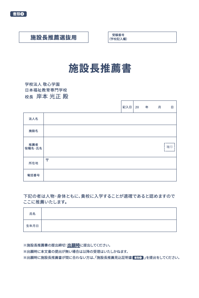 - ※出願時に施設長推薦または施設長推薦見込証明書の提出がない場合は原則認めません。