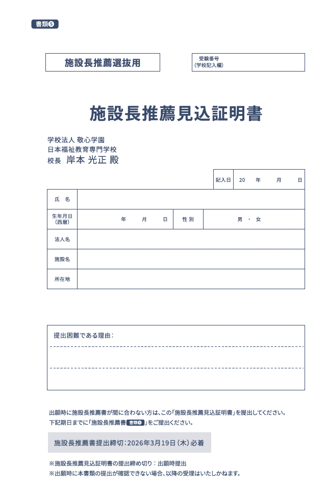 - ※出願時に施設長推薦書が間に合わない方は、「見込証明書」をご自身で作成し、提出をしてください。