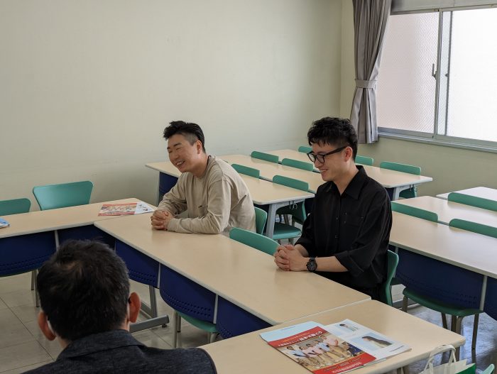 この学校で学んでいること、なぜ日本福祉教育専門学校で介護を学ぼうと思ったのかなど、視察団の方と在校生(2年生)で会話が広がっていました。