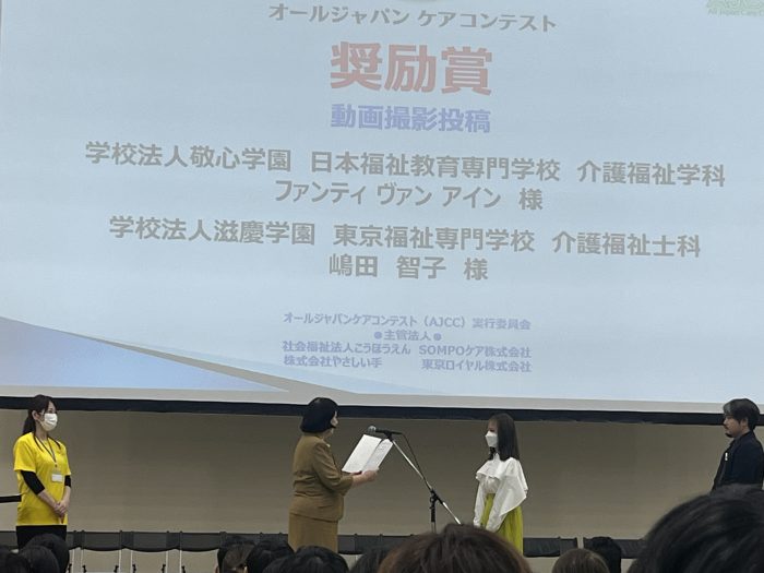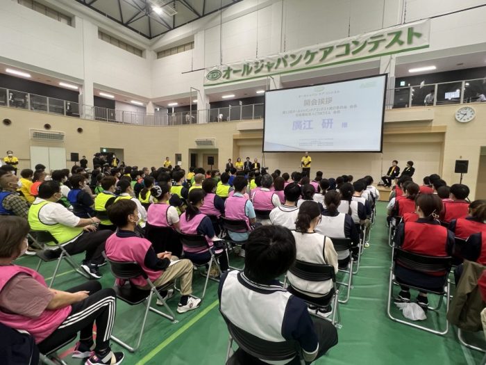 ※オールジャパンケアコンテスト(AJCC)は、「介護の質の向上と地域との繋がりを目指して」という理念のもと、介護に携わる人たちが生き甲斐を感じ、知識や技術の向上を高めるとともに、地域、社会において介護への関心と理解を深めることが必要であると考えて開催するものです。全国から集まった選手(介護従事者)、地域の方、介護サービスご利用者やそのご家族など介護に携わる方々と一緒に、これまでの介護を見つめ直し、これからの介護を考え実践する機会を提供することを目的としています。(公式HPより引用)