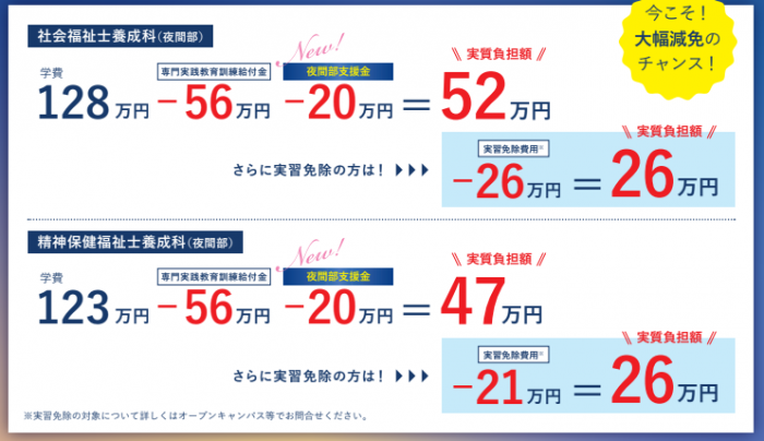 働きながら夜間部で社会福祉士・精神保健福祉士を目指そうとお考えの皆様のハードルのひとつとなっている学費に対して、