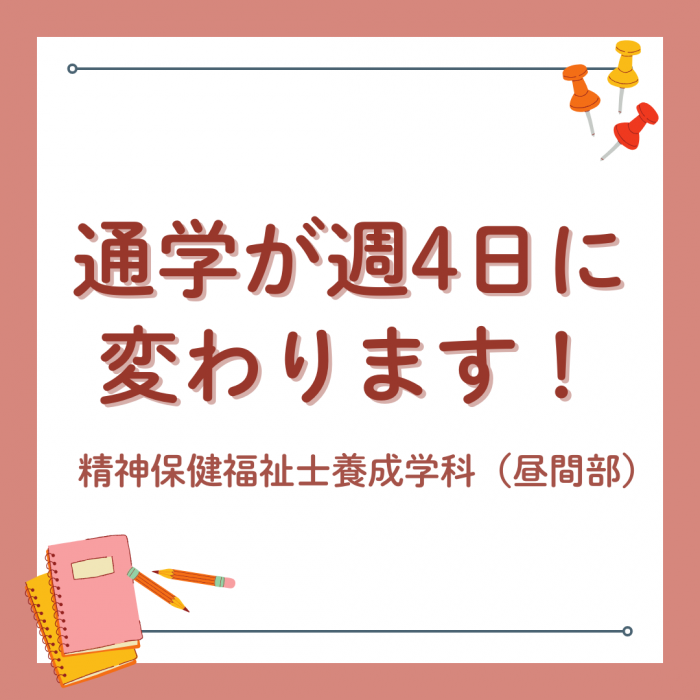 2025年4月より、精神保健福祉士 養成学科(昼間部)の授業の通学が、週5日から週4日に変わります!