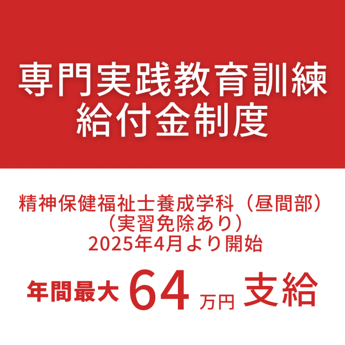 2025年度4月より新たに精神保健福祉士養成学科(昼間部)(実習免除あり)が専門実践教育訓練給付金対象講座に指定されました。