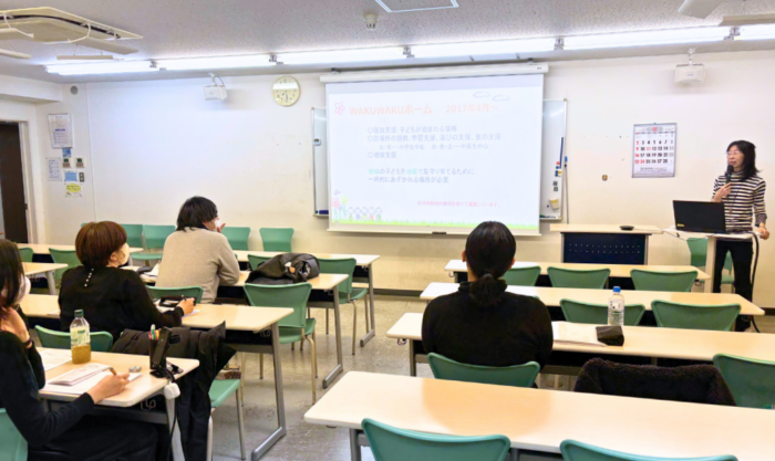今回の授業では、「地域の子供を地域で見守り育てる」というテーマで、豊島子どもWAKUWAKUネットワークの事務局長であり、日福の卒業生でもある天野敬子さんをお招きしました。