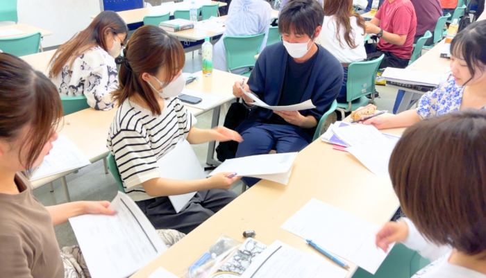 まずは個別で資料を読み込み、「社会参加のバリエーション」や「その見つけ方」についてじっくり考えたあと、5~6人のグループで意見交換を行いました。