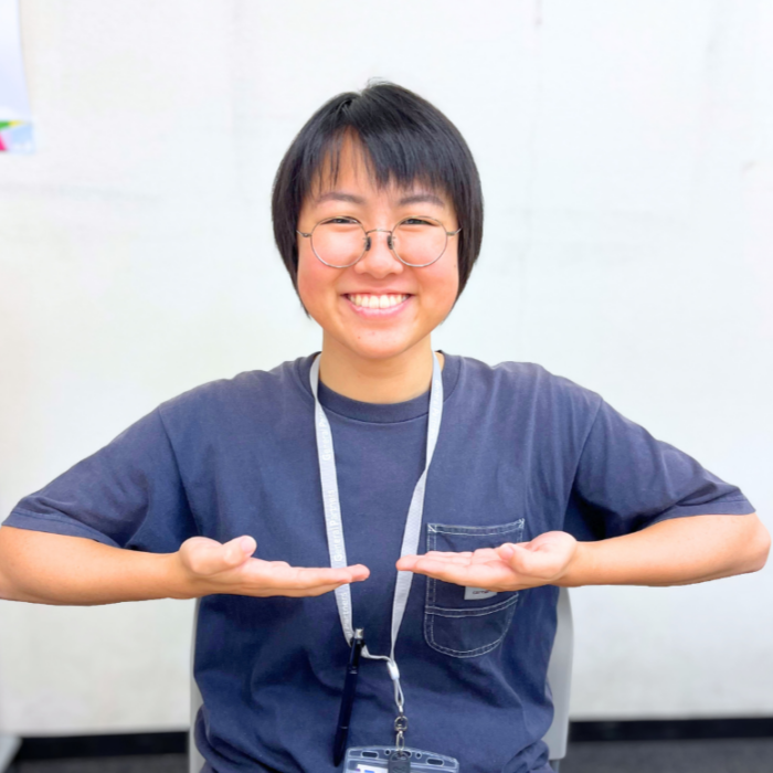 ▲“働く”の手話(=手を横にしたポーズ)をしてみました